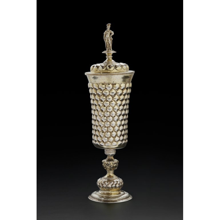 The decoration of small embossed embossings covering the surface of this cup, the lid and the upper part of the foot, is probably inspired by the grape bunch-shaped cups (Traubenpokal) widely used in German territories.
