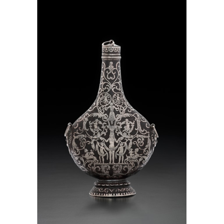 The damascened decoration is very remarkable. It is made in slight relief and the openwork and engraved silver is inlaid in the body of the bottle. This technique may be close to that used by Italian gunsmiths in the 16th century, particularly in Milan, but it is also found on objects related to everyday life such as boxes.