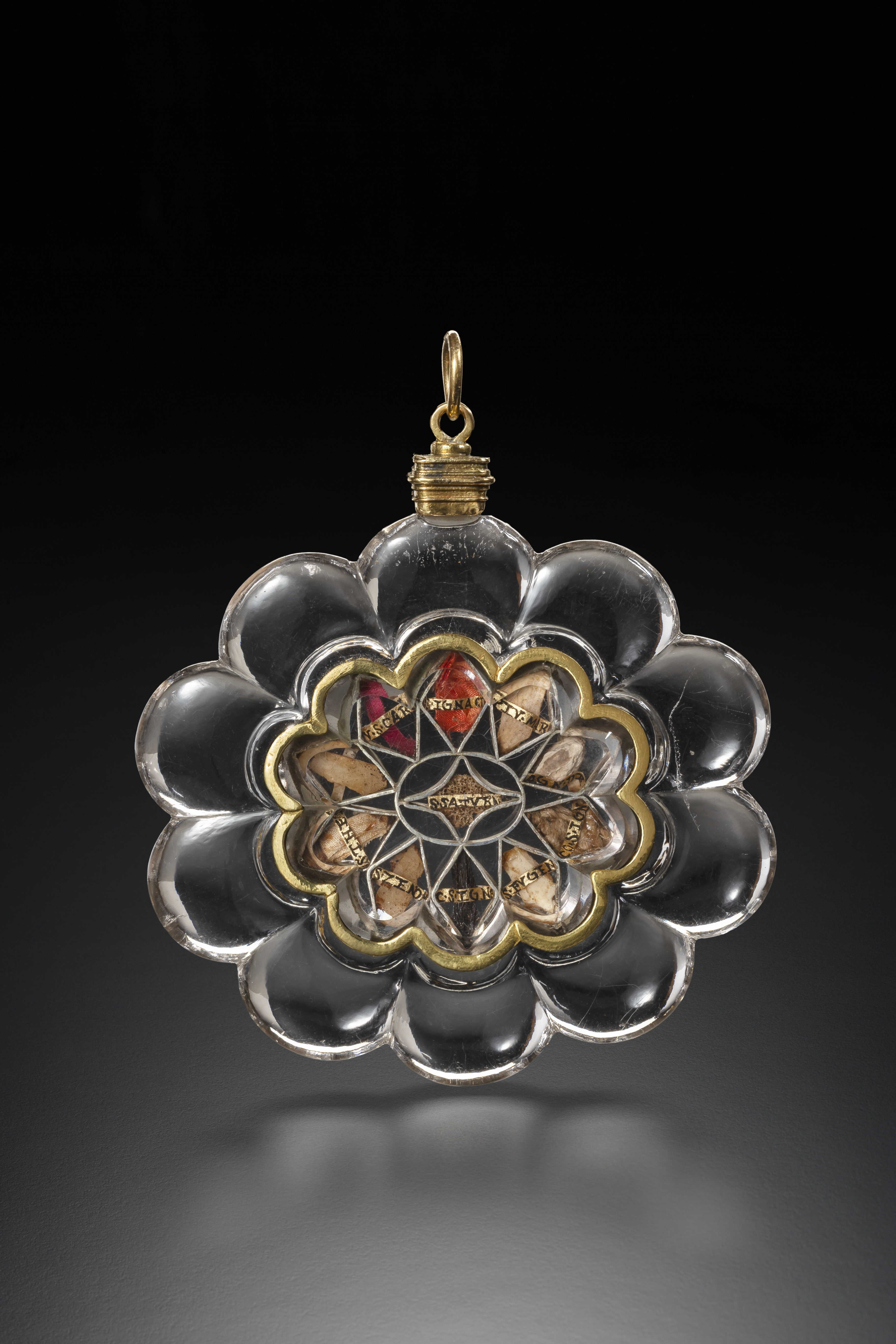Gold and rock crystal, paper and relics.